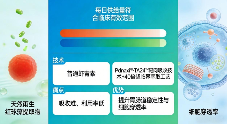 成分有效性:虾青素源自天然雨生红球藻提取物,每日供给量符合临床有效范围,搭配 Pdnaxi?-TA24?靶向吸收技术与 40 倍超临界萃取工艺,大幅提升虾青素的胃肠道稳定性与细胞穿透率,避免普通虾青素 “吸收难、利用率低” 的痛点;