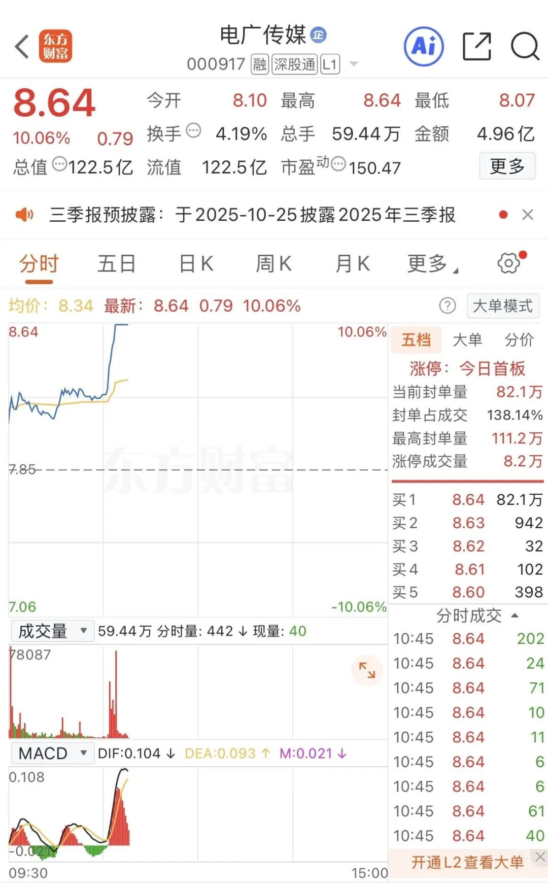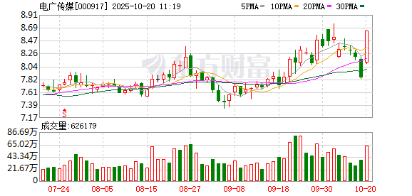 20日早盘,电广传媒(000917)高开高走,10点30分后直线拉升,迅速封死涨停板。截至发稿,最新股价报8.64元/股。
