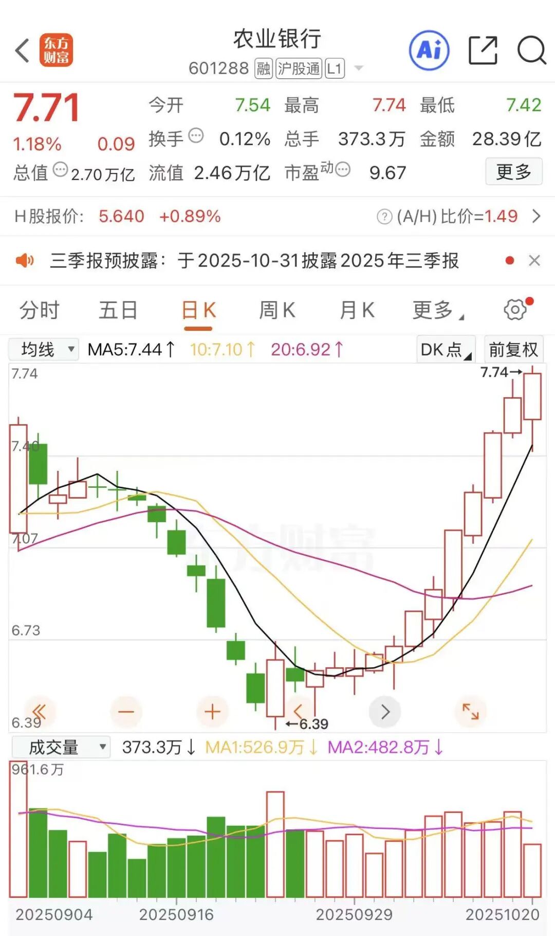 农业银行盘中探底回升,现涨超1%,股价续创历史新高,日K线录得12连阳,截至发稿,最新股价报7.71元/股,总市值突破2.7万亿元。