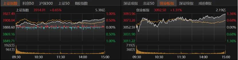 沪指收涨0.65%报3914.01点,创业板指收涨1.31%报3092.5点,深证成指收涨1.25%。科创50、沪深300、上证50涨约1%,北证50收涨1.52%。