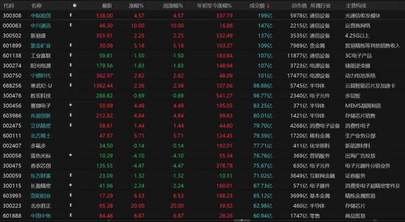 市场共计3398只个股收涨,涨停股76只;1872只个股收跌,跌停股7只。今日共有7只个股日成交额超过100亿元,CPO概念龙头股中际旭创收涨4.57%报538元/股,新易盛收涨2.25%报355.61元/股,中兴通讯涨停,紫金矿业涨逾5%报30.06元/股。阳光电源跌近2%,宁德时代涨近3%。