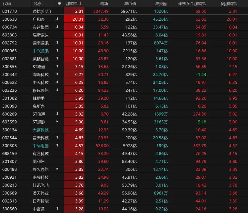 8只通信股涨停,广和通“20cm”涨停,实达集团(维权)、瑞斯康达、通宇通讯、中兴通讯、美格智能涨停。