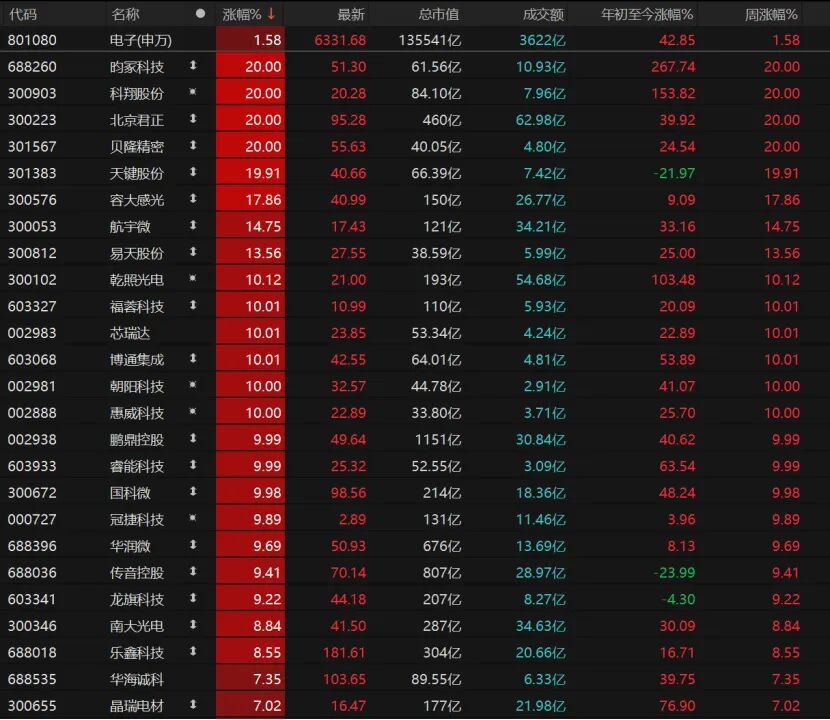 12只电子股涨停,昀冢科技、科翔股份、北京君正、贝隆精密、天键股份“20cm”涨停,福蓉科技(维权)、芯瑞达、博通集成、朝阳科技、惠威科技、鹏鼎控股、睿能科技涨停。