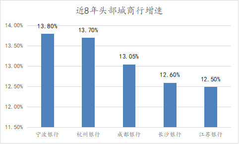 在A股头部城商行中,杭州银行的成长性长期处于行业前列。从近8年的中长期视角来看,除同省的宁波银行外,杭州银行的增速表现领先于其他头部城商行。