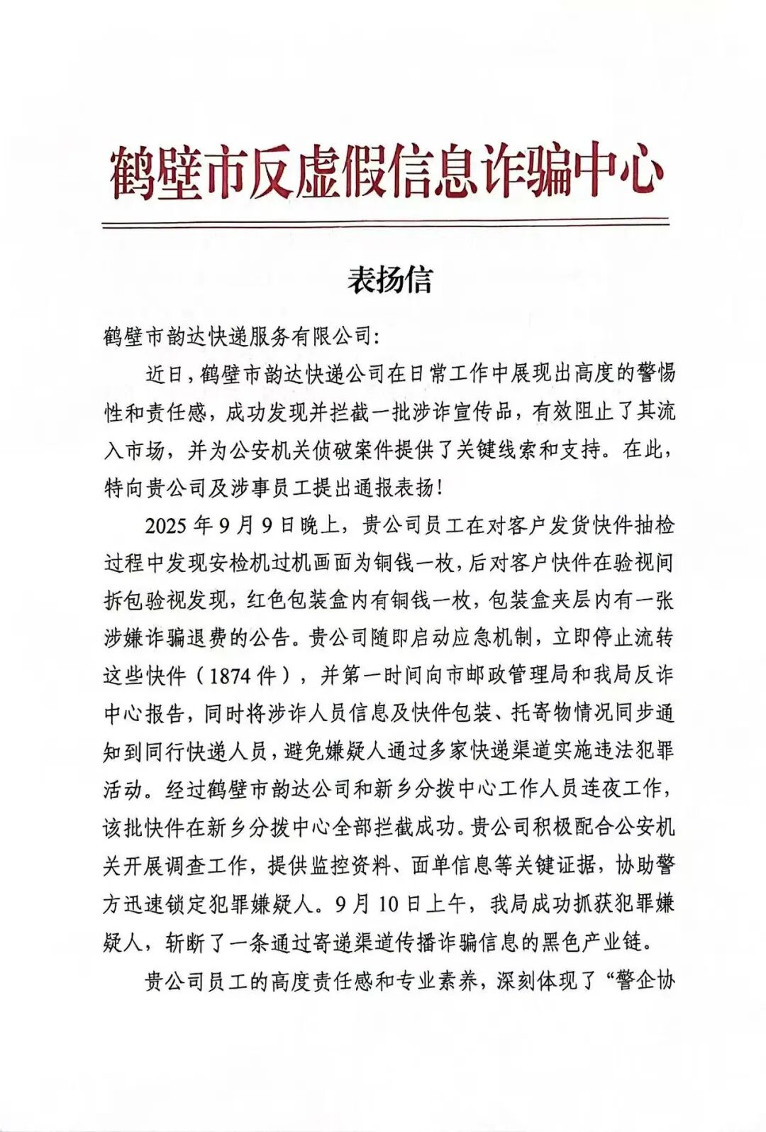 今年9月,韵达河南鹤壁网点一员工在一次例行抽检中,发现一个包裹手感异常。这份警觉,与后台系统此前对该寄件人批量寄递行为的轻度预警不谋而合。经开包验视,果然查获了夹藏在衣物中的诈骗“引流”公告。网点立即启动应急机制,第一时间拦截快件,并上报主管部门及反诈中心,并在韵达内部协同网络内同步预警。最终,在韵达鹤壁网点与韵达新乡转运中心的连夜协作下,该批涉诈快件被全部截获,为警方锁定嫌疑人、斩断犯罪链条提供了关键突破口。此举获得了鹤壁市反虚假信息诈骗中心的通报表扬。