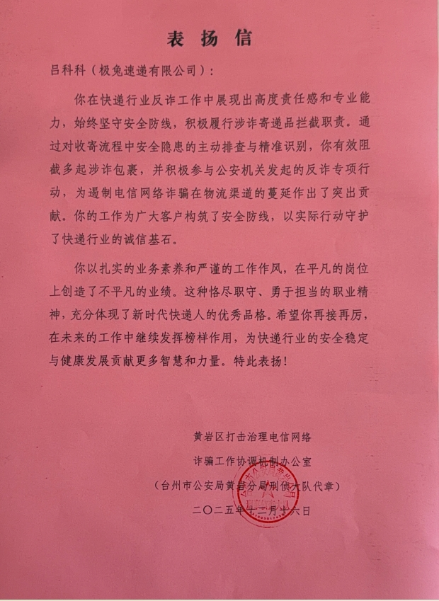 目前反诈成效显著:2024年12月至2025年2月浙江拦截涉诈“小卡片”快递4000余件;2025年1月福建拦截8000余件涉诈快件;3月深圳龙岗平湖网点拦截1.9万张涉诈卡,重庆李家沱网点配合打掉电信诈骗帮信犯罪团伙;12月台州转运中心安全员吕科科获当地反诈办表扬。未来,极兔将深化协同、升级技术,持续守护消费者财产安全与寄递市场清朗。