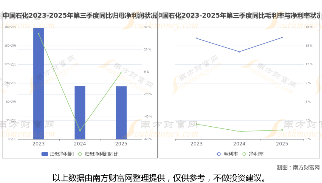 2025年第三季度季报显示,中国石化公司实现净利润85.01亿,同比上年增长率为-0.5%,毛利率16.33%,归属净利润85.01亿,同比增长-0.5%。