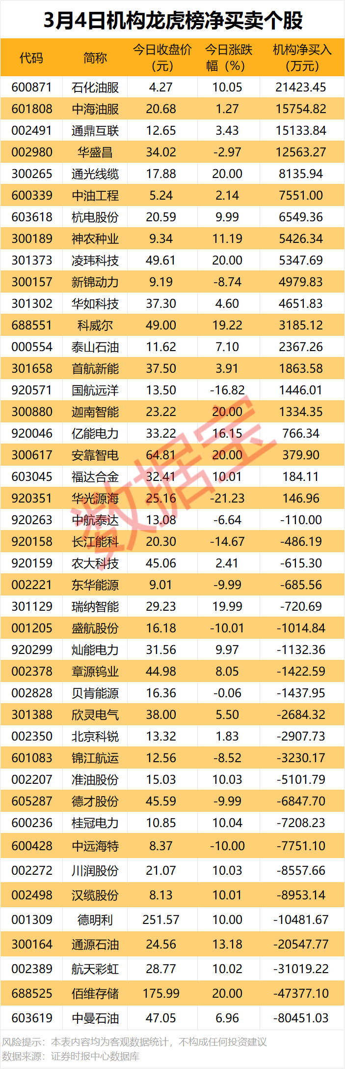 今日龙虎榜中,净买入个股有20只,净卖出的个股为23只。16股净买入金额均超千万元,石化油服获机构净买入2.14亿元,居首;其次是中海油服,机构净买入金额为1.58亿元。