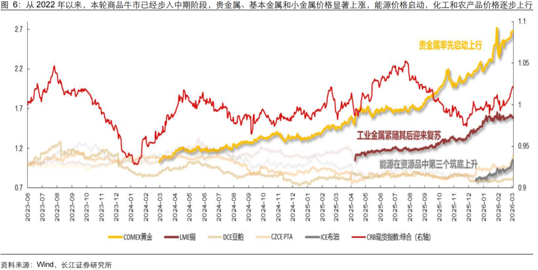 从历史商品轮动规律来看,下一个或是化工和农产品。无论是哪种通胀模式,总体的轮动顺序都是从贵金属>基本金属>能源>化工>农产品,当前金属价格已经显著上涨,在美伊冲突影响下,原油价格已经启动,我们预计下一个或是化工和农产品涨价行情,从权益市场角度来看,重点关注A股和港股中相关的细分行业和公司。