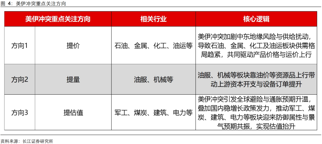 短期关注美伊事件所带的投资机会,从历史规律来看,美伊冲突的投资机会可围绕提价、提量、提估值三大方向展开:1)提价层面,地缘冲突引发供给端扰动,石油、金属、化工及油运等行业供需格局趋紧,产品价格与航运运价有望上行;2)提量层面,油价中枢上移将带动油服、机械等领域资本开支增加,设备订单与业务量显著提升;3)提估值层面,避险情绪与通胀预期升温,叠加国内稳增长政策发力,有望推动军工、煤炭、建筑、电力等板块实现估值抬升。