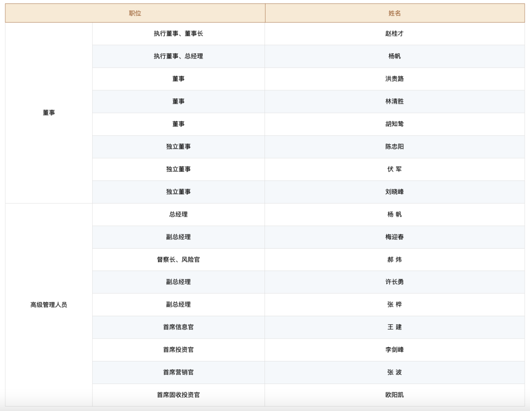总经理杨帆,副总经理梅迎春、许长勇、张桦,督察长兼风险官郝炜,首席信息官王建,首席投资官李剑峰,首席营销官张波以及首席固收投资官欧阳凯。