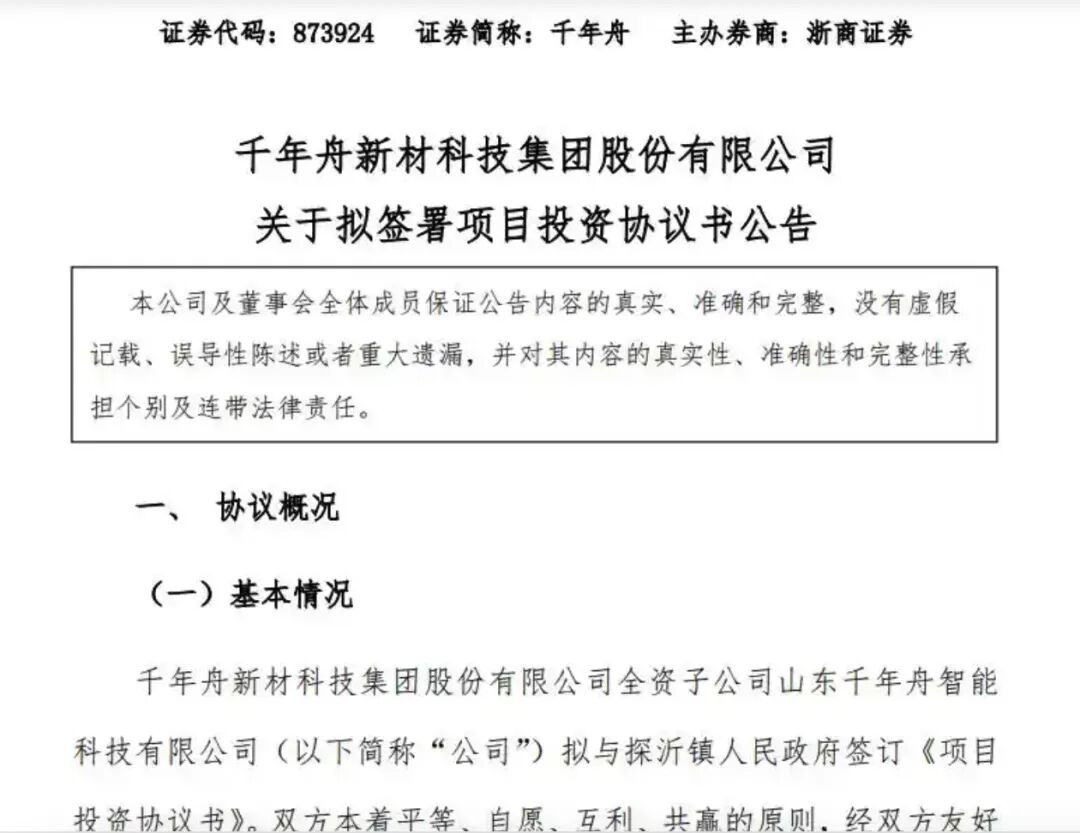 3月3日,千年舟(873924.NQ)发布公告,全资子公司山东千年舟智能科技有限公司拟与探沂镇人民政府签订《项目投资协议书》。