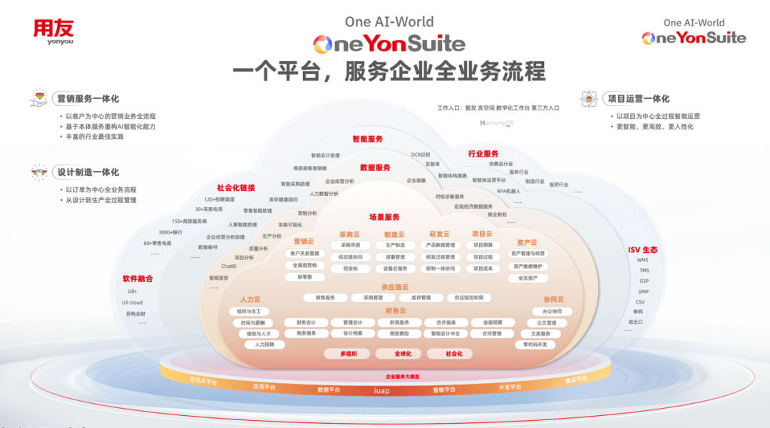 这正是用友始终坚持“One YonSuite”一体化的核心原因。YonSuite实现了企业多业务领域的一体化闭环。在这个统一平台上,数据是原生打通的,语义层是天然对齐的,不需要再做复杂的外部接口开发,AI智能体就可以直接从全局视角进行跨部门资源调度和长链条任务推理。