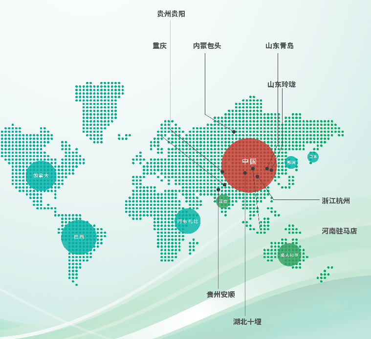 国内业务范围:河南驻马店、湖北十堰、贵州贵阳、贵州安顺、辽宁沈阳、重庆、浙江杭州、内蒙包头、山东青岛、山东玲珑、河北沙河、安徽庐江。