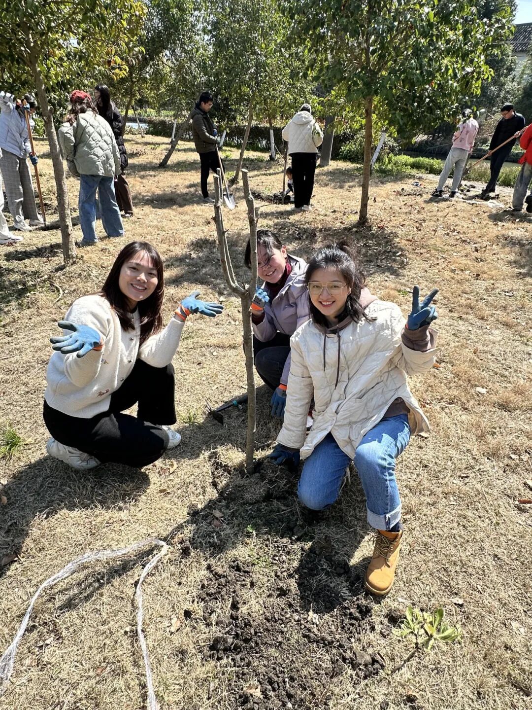 经过2小时的辛勤劳作,一排排新苗在春风中挺立成行,错落有致地点缀在林家村的绿地林间,为初春大地注入勃勃生机。看着亲手栽种的树苗,青年们纷纷驻足合影,定格下这意义非凡的瞬间。一棵棵树苗,承载着华建青年对生态文明的美好期许。