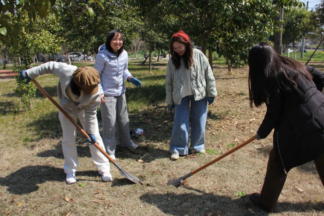 掌握技术要点后,青年们三五成组、分工协作,挥锹铲土、扶苗培土、提水浇灌,每个环节都一丝不苟。铁锹与泥土的碰撞声、青年们协作的欢笑声在田野间交织。大家在劳动中深刻体悟"一锹一土护绿意,一言一行践初心"的责任担当——这不仅是一次生态环保实践,更是一堂生动的"大思政课",让"绿水青山就是金山银山"的理念在汗水中生根发芽。