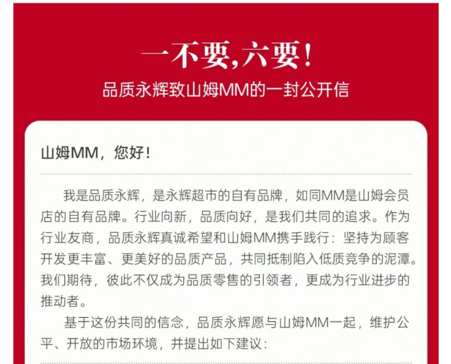 据“品质永辉”公众号,本次公开信由永辉旗下自有品牌品质永辉发布,其向山姆会员店旗下的自有品牌山姆MM直接喊话。