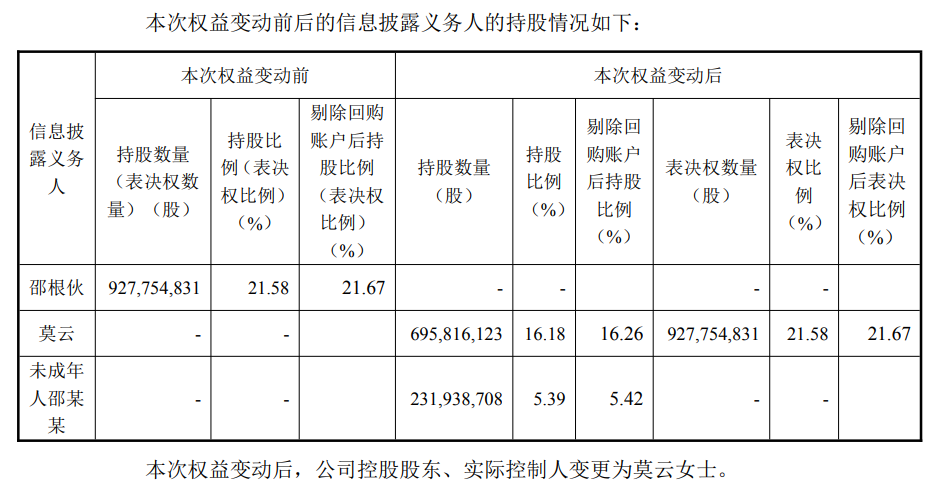 公告显示,邵根伙生前所持大北农约9.28亿股股份的50%为其遗产,由莫云及邵根伙和莫云的未成年女儿邵某某共同继承。