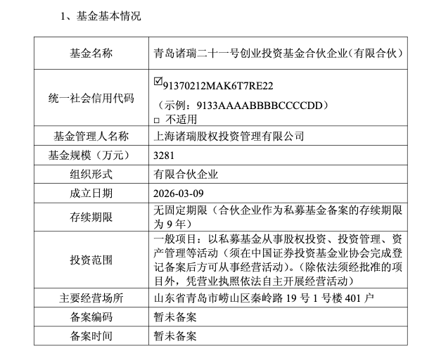 据公告披露,青岛诸瑞二十一号创业投资基金合伙企业(有限合伙)成立于2026年3月,基金规模3281万元,主要经营场所位于青岛市崂山区秦岭路,投资范围涵盖以私募基金从事股权投资、投资管理、资产管理等。