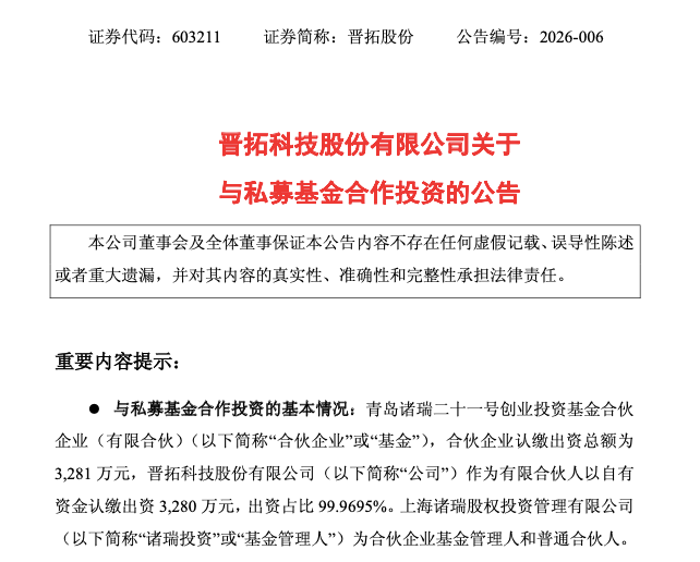 近日,上海精密零部件制造商晋拓股份(603211.SH)发布公告称,公司与上海诸瑞股权投资管理有限公司(下称“诸瑞投资”)签订了《青岛诸瑞二十一号创业投资基金合伙企业(有限合伙)合伙协议》,共同认缴合伙企业出资额。