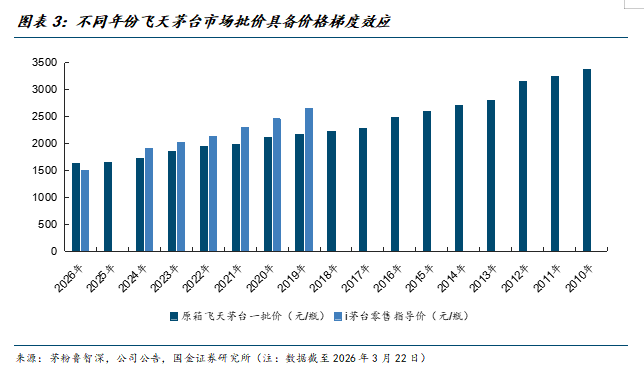 此外,公司首次披露2019~2024年产飞天茅台(次新飞天茅台)零售价,该部分产品定价较2025年末时市场一批价有明显溢价。此举一方面如公司所言,意在“强化往年贵州茅台酒的收藏消费属性”;另一方面,也在一定程度上打开了飞天茅台价格体系的桎梏。