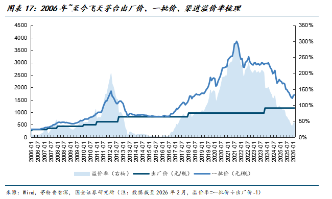 茅台酒定价机制的“非市场化”问题长期以来为市场所诟病,尤其体现于核心单品飞天茅台。回溯2006年至今,飞天茅台的渠道溢价率中枢约60%,2021年峰值一度接近300%。