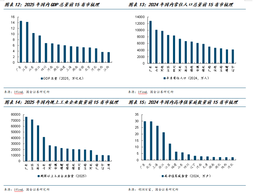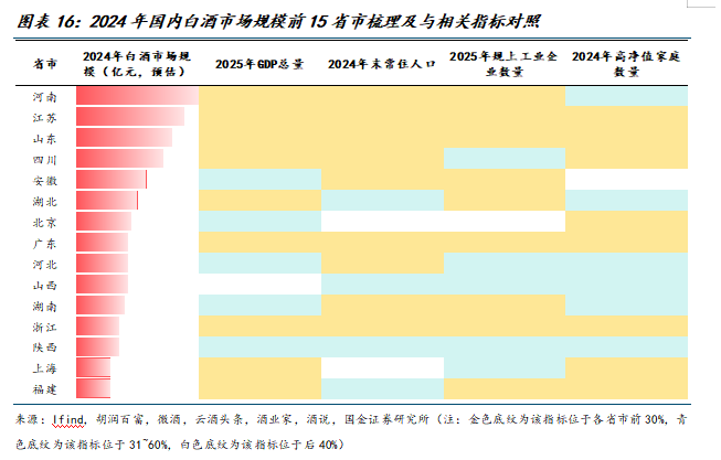 例如,我们将GDP总量、常住人口数量、规上工业企业数量、高净值家庭数量等指标与预估的区域白酒消费规模进行对比,可以发现:上述各项指标均位于前30%分位的省市仅有江苏、山东、广东、浙江,而这四省的白酒消费规模差异依然显著。北京、上海作为白酒消费、尤其高端白酒消费的高地市场,其常住人口数量均位于后40%分位;安徽作为传统白酒消费大省,但其高净值家庭数量位于后40%分位。以上数据均说明,仅依赖宏观指标难以完整刻画区域白酒需求的真实状况。