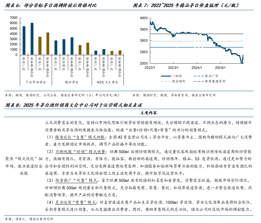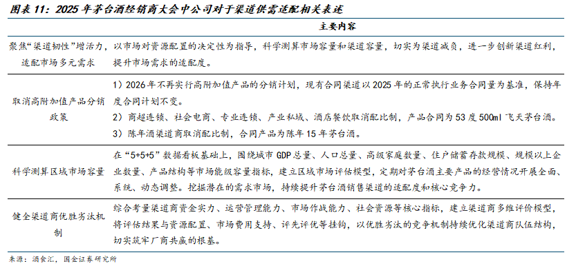 其中,我们认为经销模式更倾向于存量范畴。参考公司在2025年末茅台酒经销商大会中对取消高附加值产品分销政策的相关表述:1)2026年不再实行高附加值产品的分销计划,现有合同渠道以2025年正常执行合同量为基准、保持年度合同计划不变。2)商超、电商等渠道取消配比制,产品合同为53度500ml飞天茅台酒。3)陈年酒渠道商取消配比制,合同产品为十五年份茅台酒。从以上表述能看出,对于经销模式公司规划做聚焦、保持稳定为主。