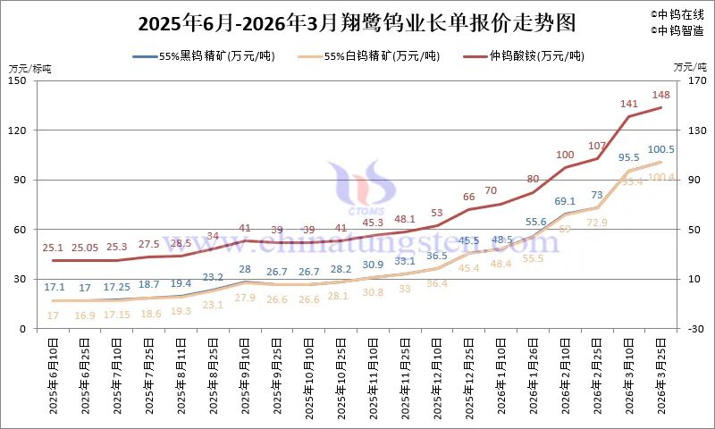 翔鹭钨业2026年3月下半月钨原料长单含税(13%增值税)单价为:55%以上黑钨精矿100.5万元/标吨,较上半月报价上调5万元/标吨,涨幅5.24%;55%以上白钨精矿100.4万元/标吨,较上半月报价上调5万元/标吨,涨幅5.24%;仲钨酸铵148万元/吨,较上半月报价上调7万元/标吨,涨幅5.0%。