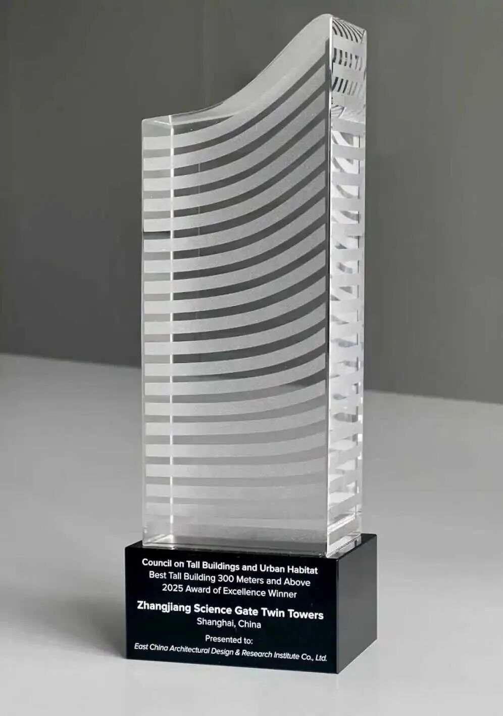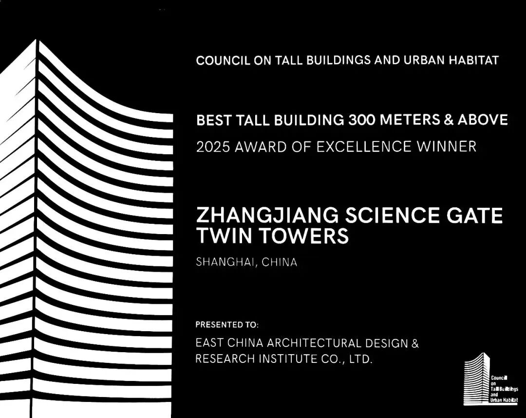2025年世界高层建筑与都市人居学会(CTBUH)全球大会在加拿大多伦多落幕,本届大会以“From the Ground Up: Tall Buildings and City-Making”为主题举办,张江“科学之门”双子塔凭借卓越的建筑设计、可持续的建造实践与深度的城市融合探索,成功摘得CTBUH全球奖最佳高层建筑奖(300米及以上类别)。这一奖项是全球高层建筑领域的权威荣誉,标志着该项目的建筑设计水平获得国际行业的高度认可。华建集团华东建筑设计研究院有限公司(下文简称“华东院”)联合Gensler建筑设计事务所,向全球展示了中国超高层建筑在科创适配、绿色可持续与城市共生方面的设计创新与实践思考。