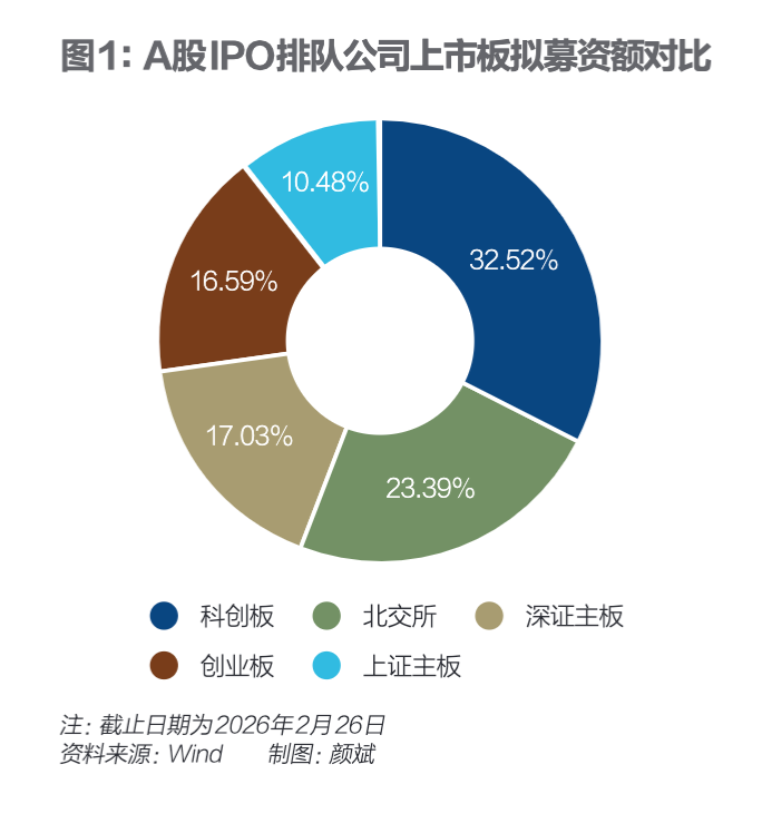 从排队上市的企业来看,截至2026年2月26日,341家A股IPO排队公司合计拟募资金额3447亿元。其中,拟登陆科创板、创业板、北交所的公司数量合计占比超八成;募资金额合计占比超七成。