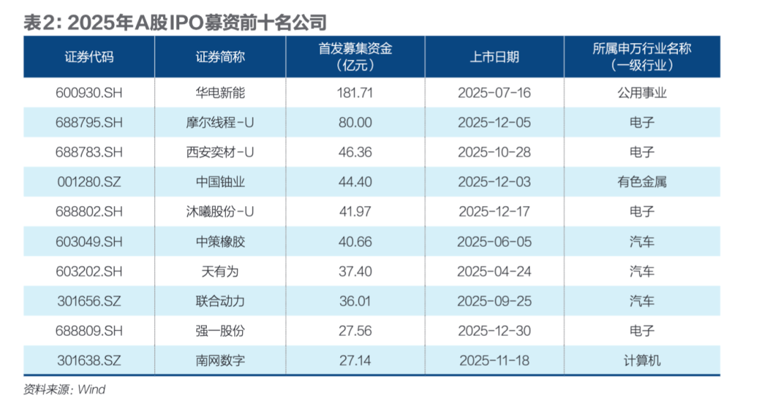 A股市场上,分行业来看,电子行业以365亿元的募资金额,高居首位。该行业的细分行业中,半导体以275亿元的IPO募资额成为主力军。2025年,共计有10家半导体公司登陆A股,摩尔线程(688795.SH)、西安奕材(688783.SH)、沐曦股份(688802.SH)募资金额均超40亿元,分居行业前三。