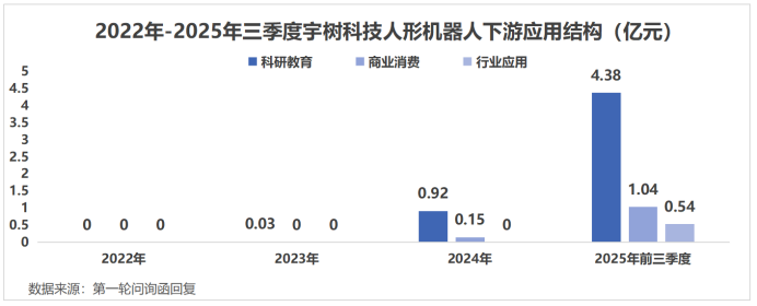 2025年前三季度,科研教育占宇树人形机器人总营收的73.6%,商业消费占17.39%,行业应用则只有9.01%。