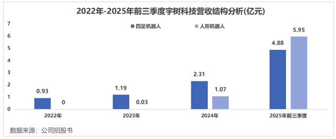 2023年,宇树人形机器人业务收入还不足300万元,但2025年前三季度,已经飙升到5.95亿元,取代四足机器人成为最大的收入来源。