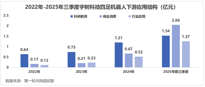 2022年科研教育占其四足机器人收入的68.61%;到了2025年前三季度,商业消费反超科研教育成为其四足机器人的第一大收入来源,占比42.3%,行业应用也升到了26.12%。
