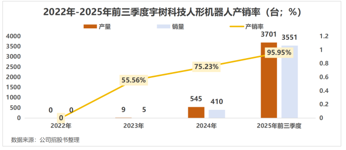 支撑起宇树人形机器人业务庞大业绩增量的,是激增的销量。2023年,宇树只卖了5台人形机器人,2025年前三季度,已经卖了3551台,产销率高达95.95%。