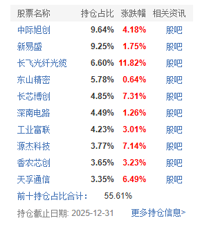 前十大重仓股是中际旭创、新易盛、长飞光迁光缆、东山精密、长芯博创、深南电路、工业富联、源杰科技、香农芯创、天孚通信。