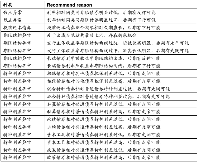 模型在实际投资中的作用,通过标准化的分割体系,将每一只债券、每一个发行主体均纳入该体系中进行评估。模型针对发行主体的定价偏离情形,主要归因于以下四类:无理由的收益率过高、无理由的收益率过低,短期债券偏离过大和提前还本债券。个券层面导致定价偏离的情形较多,主要集中于以下几类:无理由的过高或过低收益率,债券本身附带的特种利差出现异常,期限结构异常,或者研究评级本身存在错误。