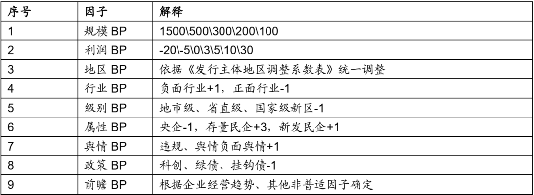当前债券市场的基金经理与投资经理,其成长路径各不相同,有的出身于信评,有的出身于交易,信评出身者更擅于研究,交易出身者则更敏锐于市场行情。既擅长研究又能把握市场行情的人才往往较为稀缺,更多的人还是在成长阶段。我们认为虽然市场行情的第一驱动力是高能力人才决定的,但稳态的价格情况是由普通投资者跟进和维持的。因此,在选择影响债券定价的影响因子时,只能抓大放小,聚焦于那些最普遍最容易被接受的逻辑,例如:资产规模越大越可靠,净利润越高越好,股东为高级别行政单位意味着更强的保护力度,绿色债和科创债因政策驱动更易获得投资者青睐,上海的企业普遍优于贵州的企业。至于一些较为小众的逻辑,例如现金对短期债务的覆盖程度、银行的拨备覆盖率等只能在特定的公司或行业适用的指标,难以作为普适影响因子。我们在建模过程中,曾尝试引入大量指标进行验证,最终许多指标被引入后又剔除,原因正是在于其无法满足普遍性适用的要求,即便是资产负债率、营业收入等相当关键的指标,在反复验证后也未能保留。最终,我们归纳出九大影响因子:规模评级、利润评级、地域评级、行业评级、行政管理级别评级、企业属性评级、舆情评级、政策评级、前瞻性评级。
