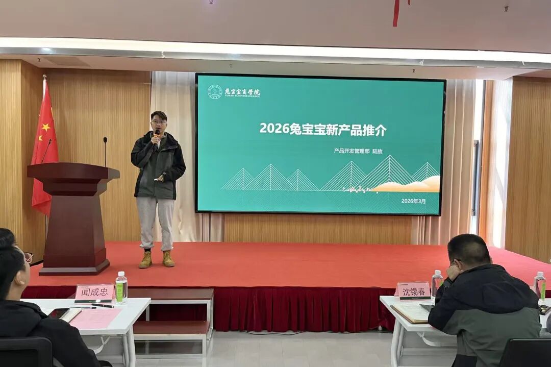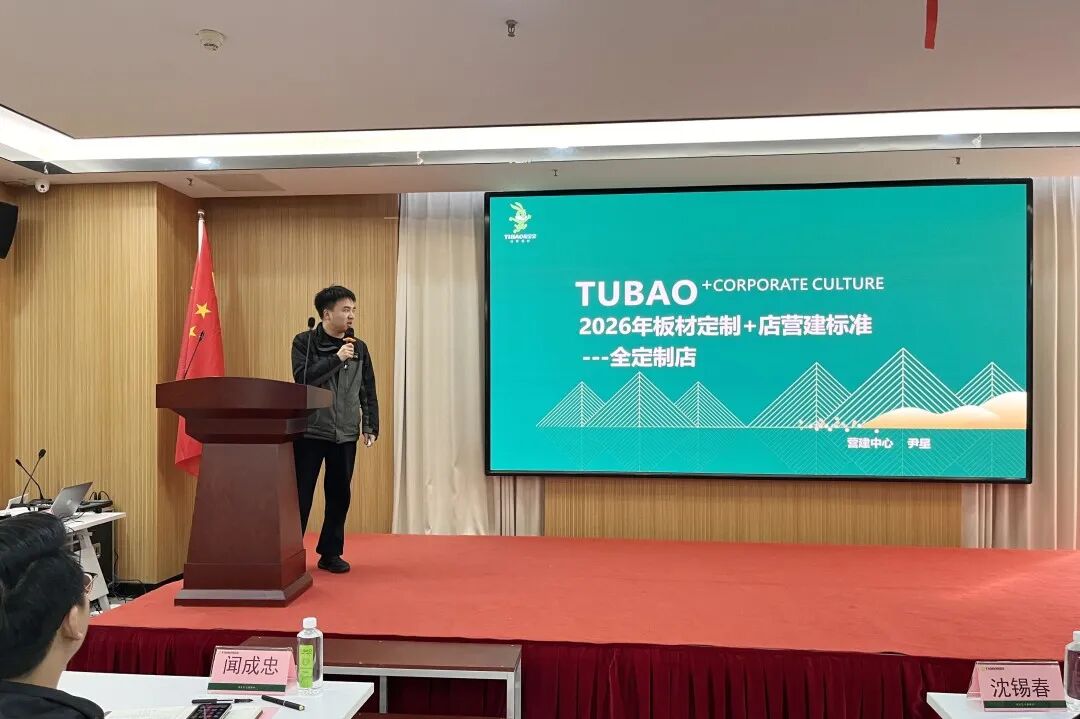 会议围绕总结复盘与战略部署展开。山东销售公司负责人闻成忠回顾了2025年工作成果,并对2026年区域发展路径作出系统规划。兔宝宝定制+、家具厂、饰材活动、营建、商学院及五金运营等板块负责人先后就渠道运营、门店营建标准、政策解读、新品推广、新零售规划及赋能支持进行专题分享,内容务实、方向清晰。