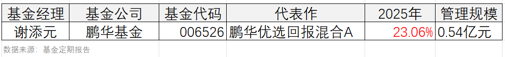 谢添元的代表作鹏华优选回报混合A,2025年录得收益率23.06%。上榜理由,作为95后基金经理的他太有趣了。
