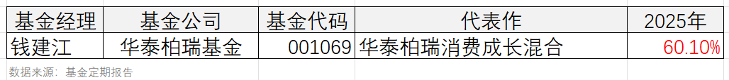 钱建江的华泰柏瑞消费成长混合,2025年度录得收益率60.10%。