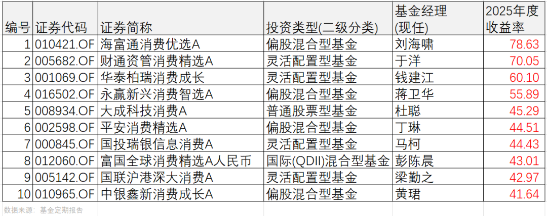 我统计了名字里带有“消费”的主动型基金2025年度的业绩排名。当然,我们并不是“唯业绩论”,更看重基金经理买了什么、怎么赚得钱,以及有些消费行业基金名字里不带“消费”二字。