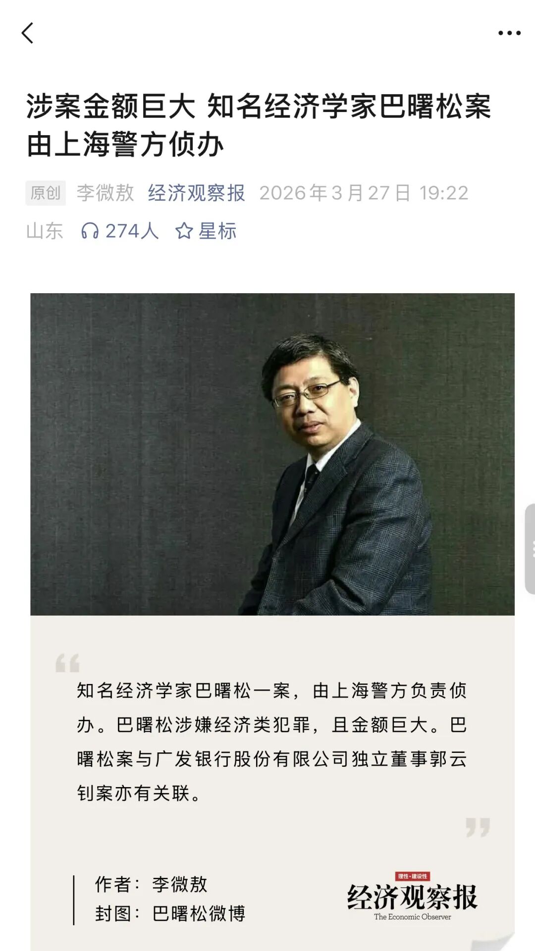 巴曙松一案,目前由上海警方负责侦办,其涉嫌经济类犯罪,且金额巨大。