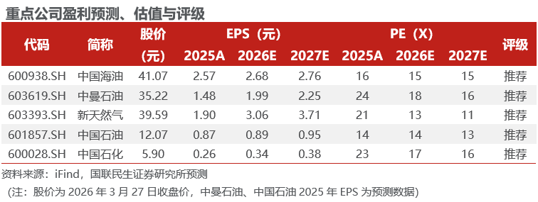 投资建议:推荐以下三条主线:1)油价上涨阶段业绩弹性较大,兼具高分红特点的中国海油;2)产量处于成长期的中曼石油、新天然气;3)行业龙头、持续高分红的中国石油、中国石化。