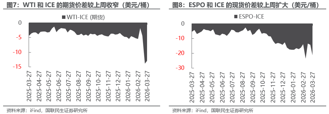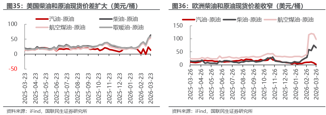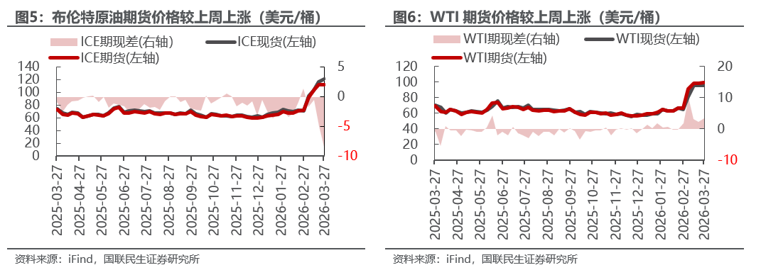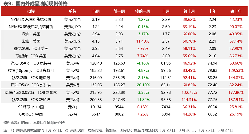 据iFind数据,截至2026年3月27日,国内汽柴油现货价格为10134、8647元/吨,周环比变化6.18%、7.26%;和布伦特原油现货价差为87.49、58.14美元/桶,周环比变化13.60%、22.06%。