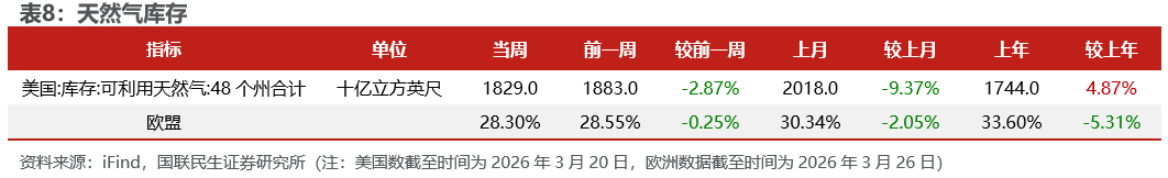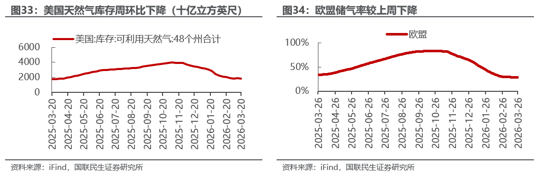欧盟储气率下降。截至3月26日,欧盟储气率为28.30%,较上周-0.25pct。