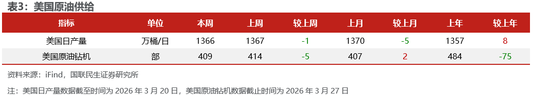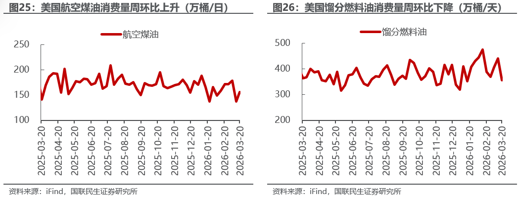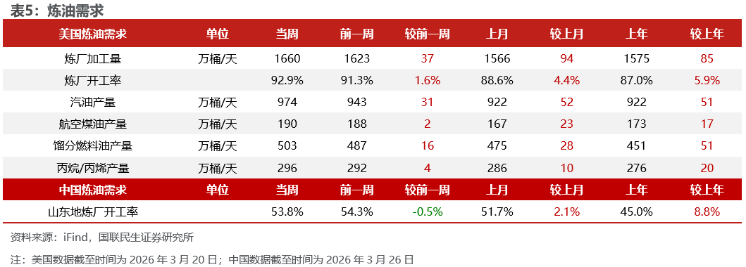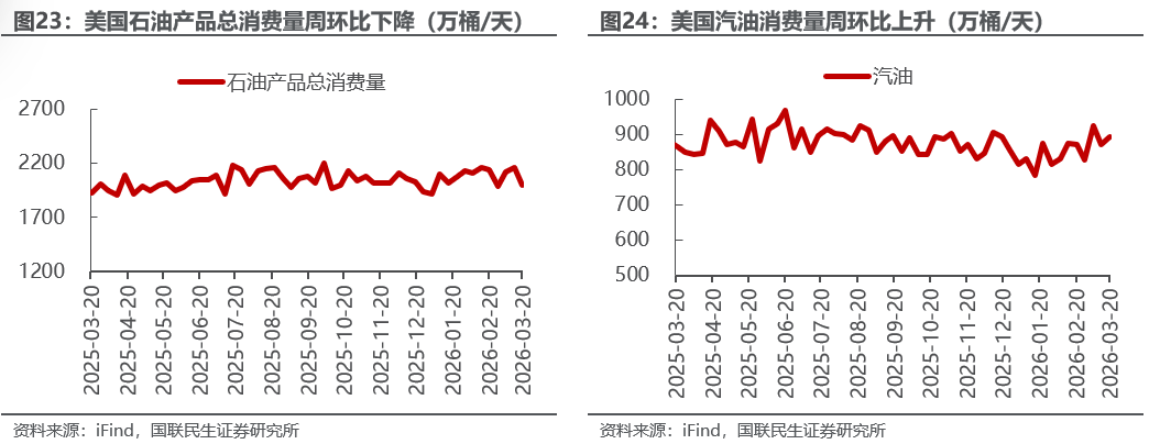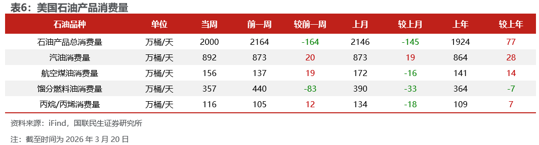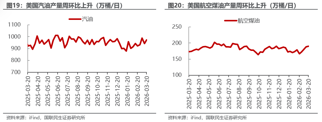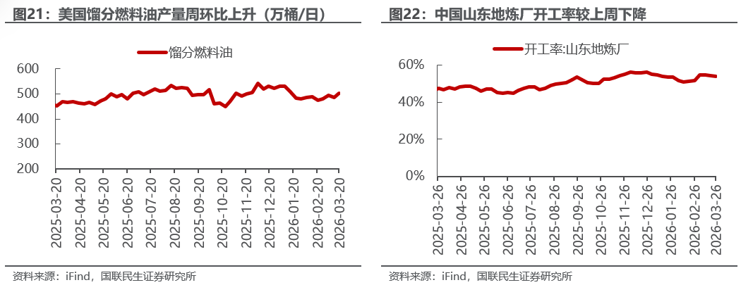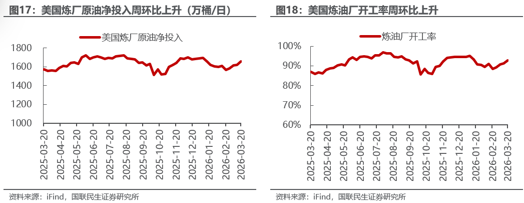 美国原油产量下降,炼油厂日加工量上升。截至3月20日,1)原油方面,美国原油产量1366万桶/日,周环比-1万桶/日。2)成品油方面,美国炼油厂日加工量1660万桶/日,周环比+37万桶/日;炼厂开工率92.9%,周环比+1.6pct;汽油/航空煤油/馏分燃料油产量分别为974/190/503万桶/日,周环比+31/+2/+16万桶/日。