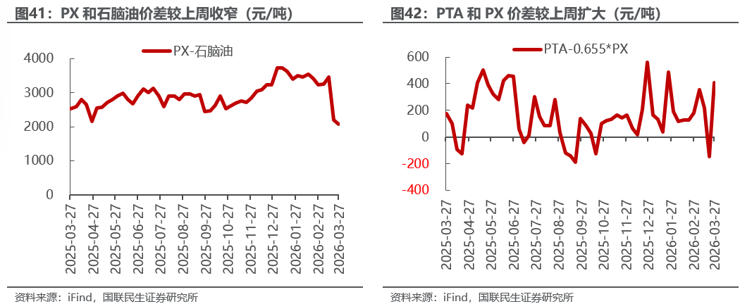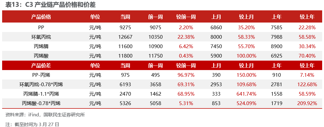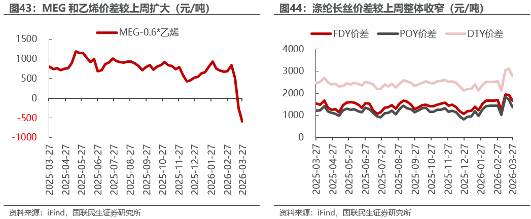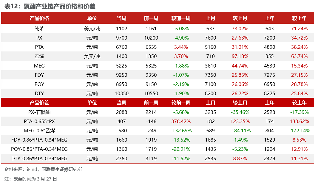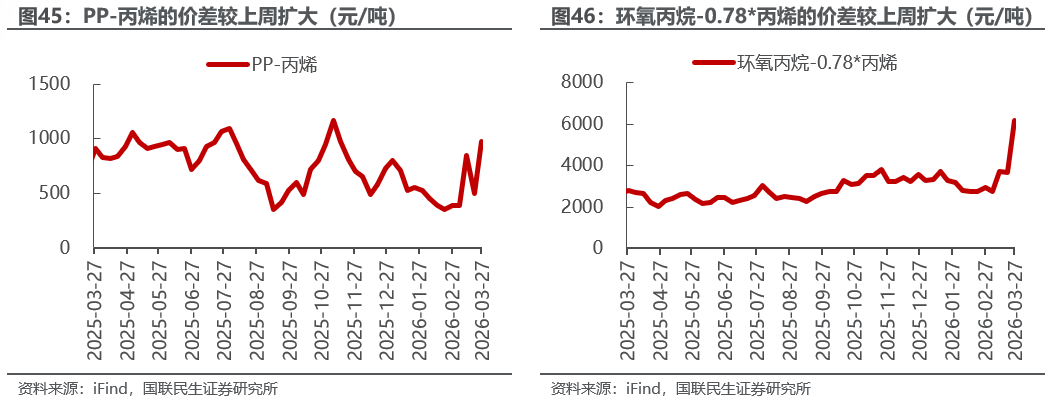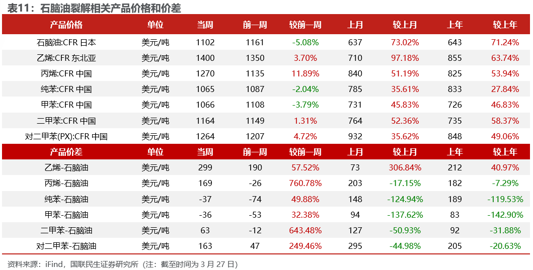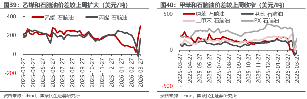 烯烃价差扩大。截至3月27日,1)炼油板块,NYMEX汽油和取暖油期货结算价3.19/4.24美元/加仑,周环比-1.27%/-0.15%,和WTI期货结算价差为34.38/78.28美元/桶,周环比-8.12%/-1.98%。2)化工板块,乙烯/丙烯/甲苯和石脑油价差分别为299/169/-36美元/吨,较上周变化+57.52%/+760.78%/+32.38%;FDY/POY/DTY价差为1660/1360/2760元/吨,较上周变化-13.52%/-20.91%/-11.52%。