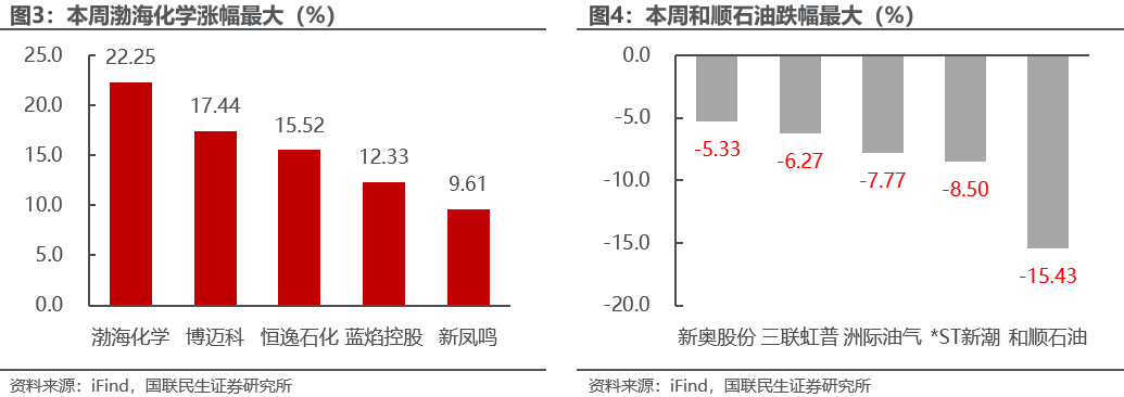 本周渤海化学涨幅最大。截至3月27日,石油石化行业中,公司周涨跌幅前5位分别为:渤海化学上涨22.25%,博迈科上涨17.44%,恒逸石化上涨15.52%,蓝焰控股上涨12.33%,新凤鸣上涨9.61%。